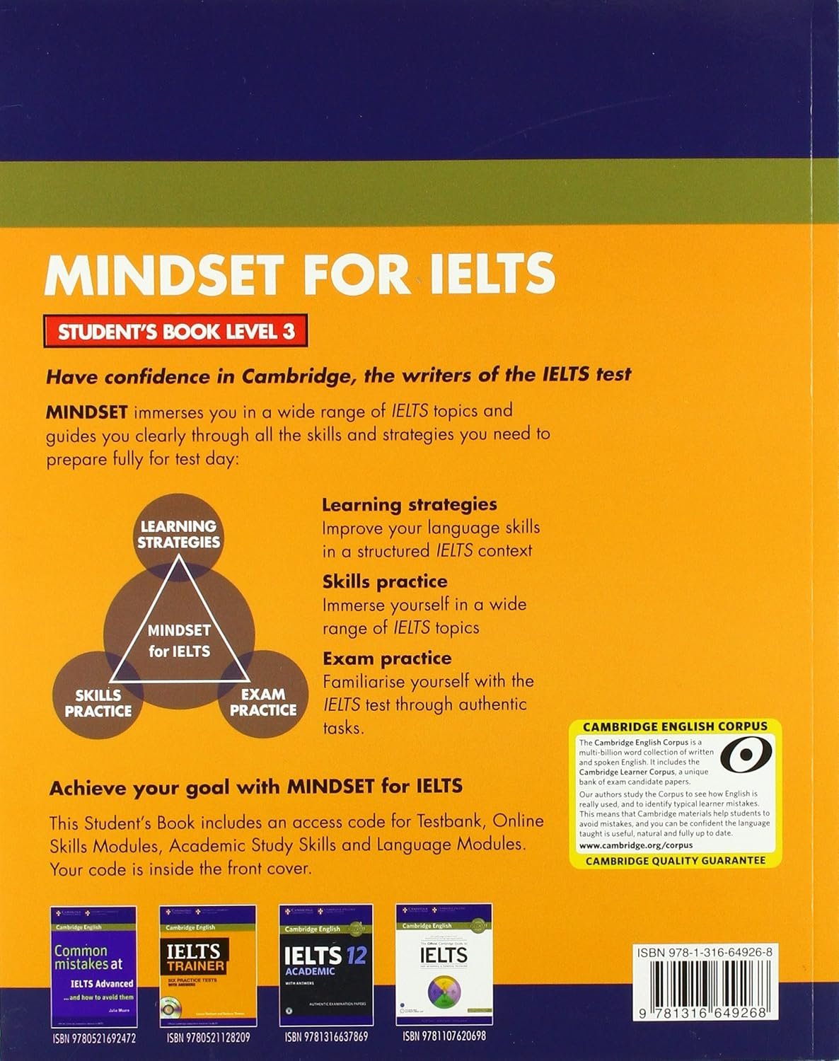 MINDSET from Cambridge gets you inside the IELTS test with a unique blend of print and online content. Topic-based units organised by skill make it easy to find what you want. Designed for students aiming for Band 7.5 in the Academic Module, this Student’s Book Level 3 includes learning strategies, skills practice and exam practice to help you achieve your goal. Online content includes skills modules, Corpus informed language specific modules and Academic Study Skills, plus access to authentic online practice tests in Testbank. *Access code printed on the inside front cover.