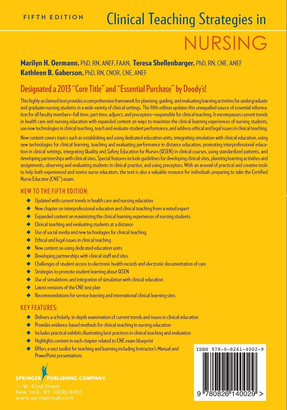 Designated a 2013 “”Core Title”” and “”Essential Purchase”” by Doody’s! This highly acclaimed text provides a comprehensive framework for planning, guiding, and evaluating learning activities for undergraduate and graduate nursing students in a wide variety of clinical settings. The fifth edition updates this unequalled source of essential information for all faculty members-full time, part time, adjunct, and preceptors-responsible for clinical teaching. It encompasses current trends in health care and nursing education with expanded content on ways to maximize the clinical learning experiences of nursing students, use new technologies in clinical teaching, teach and evaluate student performance, and address ethical and legal issues in clinical teaching. Included is new content on establishing and using dedicated education units, integrating simulation with clinical education, using new technologies for clinical learning, teaching and evaluating performance in distance education, promoting interprofessional education in clinical settings, integrating Quality and Safety Education for Nurses (QSEN) in clinical courses, using standardized patients, and developing partnerships with clinical sites. Special features include guidelines for developing clinical sites, planning learning activities and assignments, observing and evaluating students in clinical practice, and using preceptors. With an arsenal of practical and creative tools to help both experienced and novice nurse educators, the text is also a valuable resource for individuals preparing to take the clinical nurse educator (CNE) exam. New to the Fifth Edition: Updated with current trends in health care and nursing education New chapter on interprofessional education and clinical teaching from a noted expert Expanded content on maximizing the clinical learning experiences of nursing students Clinical teaching and evaluating students at a distance Use of social media and new technologies for clinical teaching Ethical and legal issues in clinical teaching New content on using dedicated education units Developing partnerships with clinical staff and sites Challenges of student access to electronic health records and electronic documentation of care Strategies to promote student learning about QSEN Use of simulations and integration of simulation with clinical education Latest revisions of the CNE test plan Recommendations for service learning and international clinical learning sites Key Features: Delivers a scholarly, in-depth examination of current trends and issues in clinical education Provides evidence-based methods for clinical teaching in nursing education Includes practical exhibits illustrating best practices in clinical teaching and evaluation Highlights content in each chapter related to CNE exam blueprint Offers a vast toolkit for teaching and learning including Instructor’s Manual and PowerPoint presentation