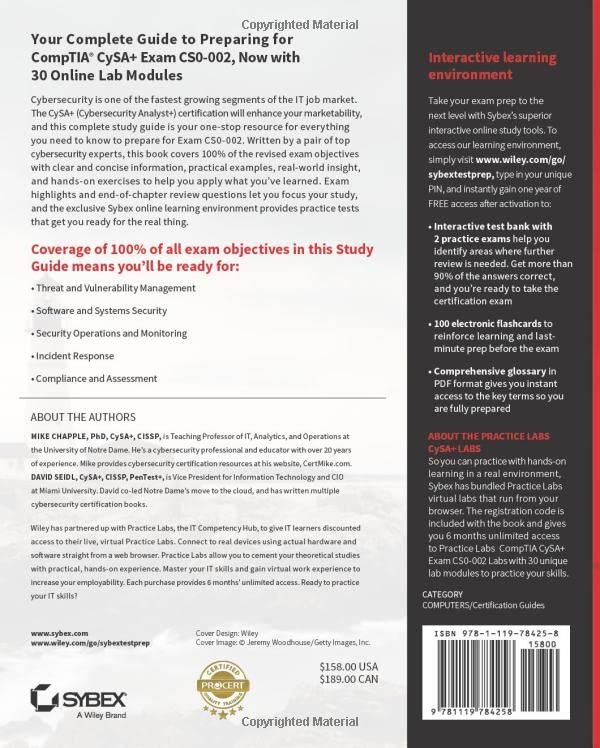 Cybersecurity is one of the fastest growing segments of the IT job market. The CySA+ (Cybersecurity Analyst+) certification will enhance your marketability, and this complete study guide is your one-stop resource for everything you need to know to prepare for Exam CS0-002. Written by a pair of top cybersecurity experts, this book covers 100% of the revised exam objectives with clear and concise information, practical examples, real-world insight, and hands-on exercises to help you apply what you’ve learned. Exam highlights and end-of-chapter review questions let you focus your study, and the exclusive Sybex online learning environment provides practice tests that get you ready for the real thing.