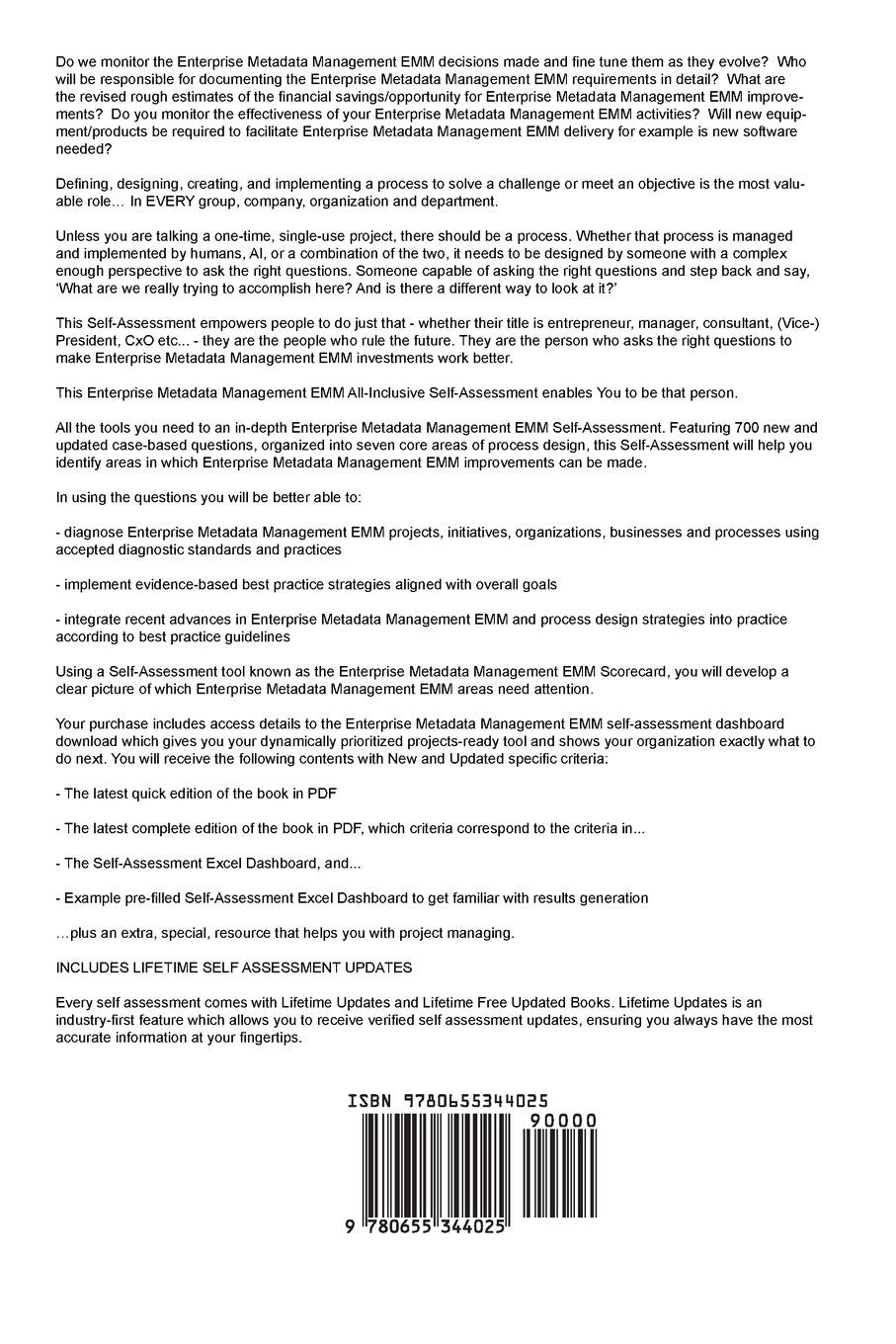 INCLUDES all the tools you need to an in-depth Enterprise Metadata Management EMM Self-Assessment. Featuring new and updated case-based questions, organized into seven core levels of Enterprise Metadata Management EMM maturity, this Self-Assessment will help you identify areas in which Enterprise Metadata Management EMM improvements can be made.