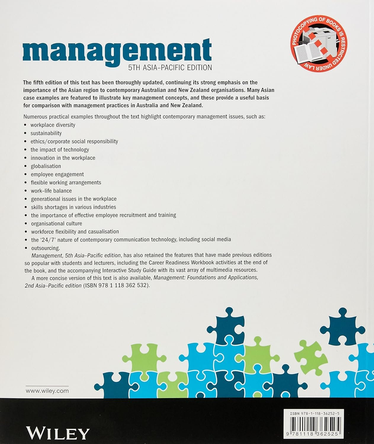 Management, 5th Asia Pacific edition, has also retained the features that have made previous editions so popular with students and lecturers, including the Career Readiness Workbook activities at the end of the book, and the accompanying Interactive Study Guide with its vast array of multimedia resources.
