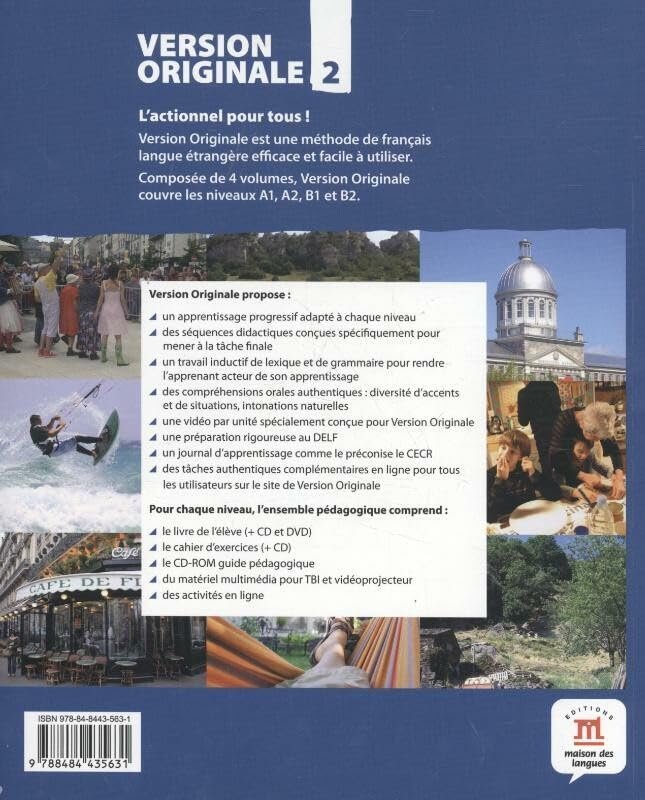 ¡El enfoque por tareas al alcance de todos con Version Originale! El Libro del alumno + CD audio + DVD de Version Originale 2 forma parte de la colección Version Originale, un método de referencia para la enseñanza del Francés Lengua Extranjera dirigido a los adultos. Una progresión estructurada en torno a la realización de tareas finales variadas Enfoque inductivo en el léxico y la gramática Referencias sistemáticas a las Actividades 2.0: una serie de tareas complementarias disponibles en línea Ofrece una gran variedad de documentos auténticos que permiten abordar el idioma desde un enfoque contextualizado, y secciones Regards sur para un acercamiento al mundo francófono Un DVD con todos los vídeos de las secciones On tourne ! del método Un primer contacto con el DELF A2 y páginas Journal dapprentissage para valorar los conocimientos y las competencias